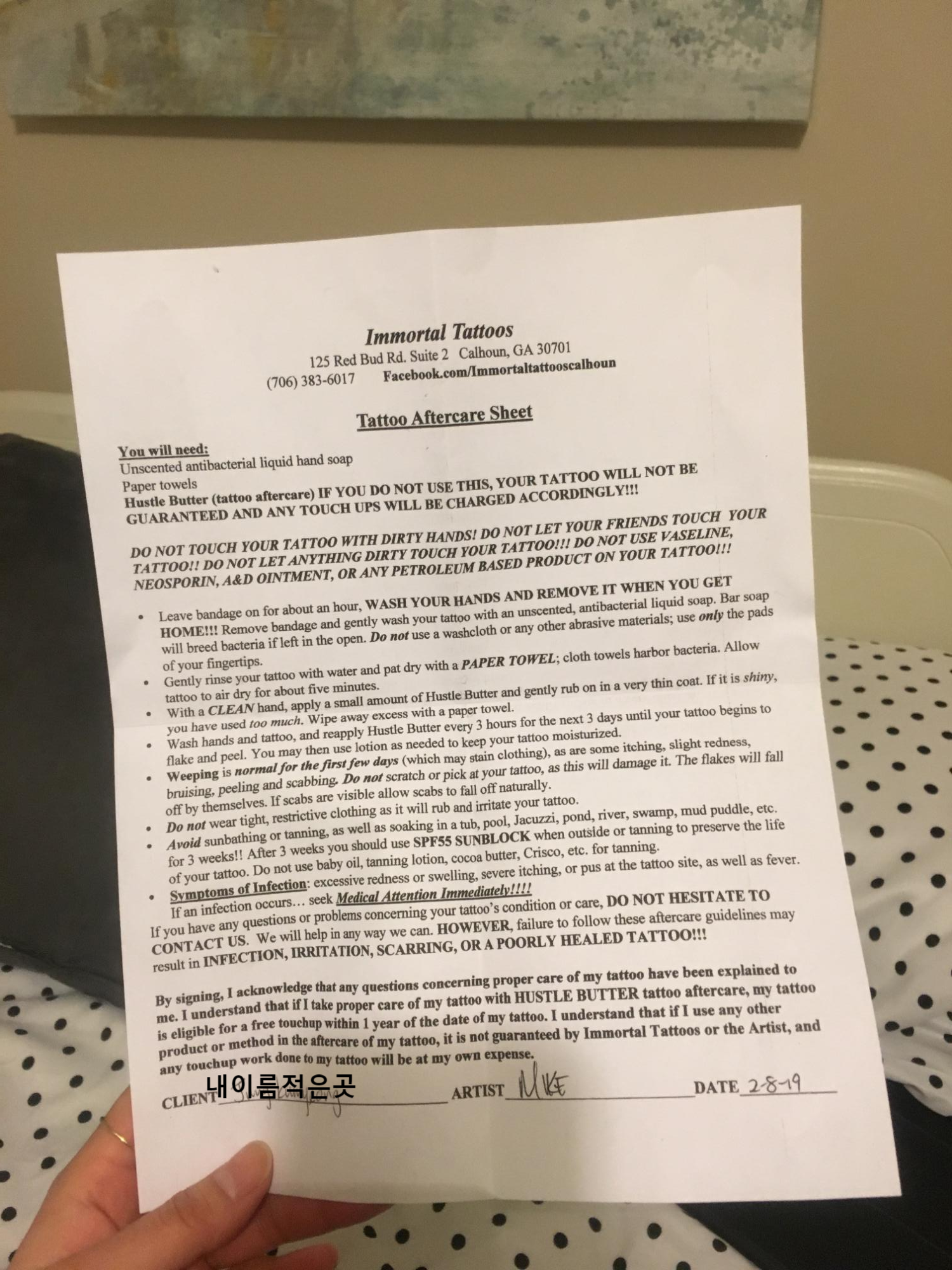 미국은 타투가 합법이기 때문에 동의서도 쓰고 타투 관리법도 친절하게 프린터로 작성해서 줬다.