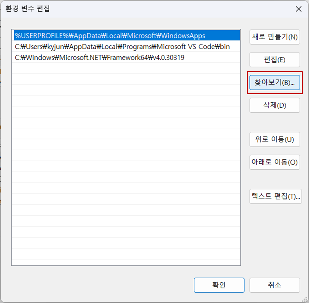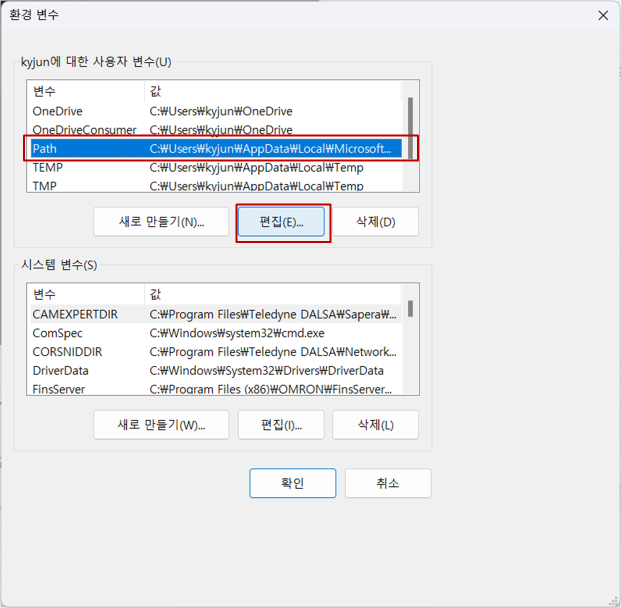 - 사용자 변수의 Path 클릭 > 편집 버튼 클릭