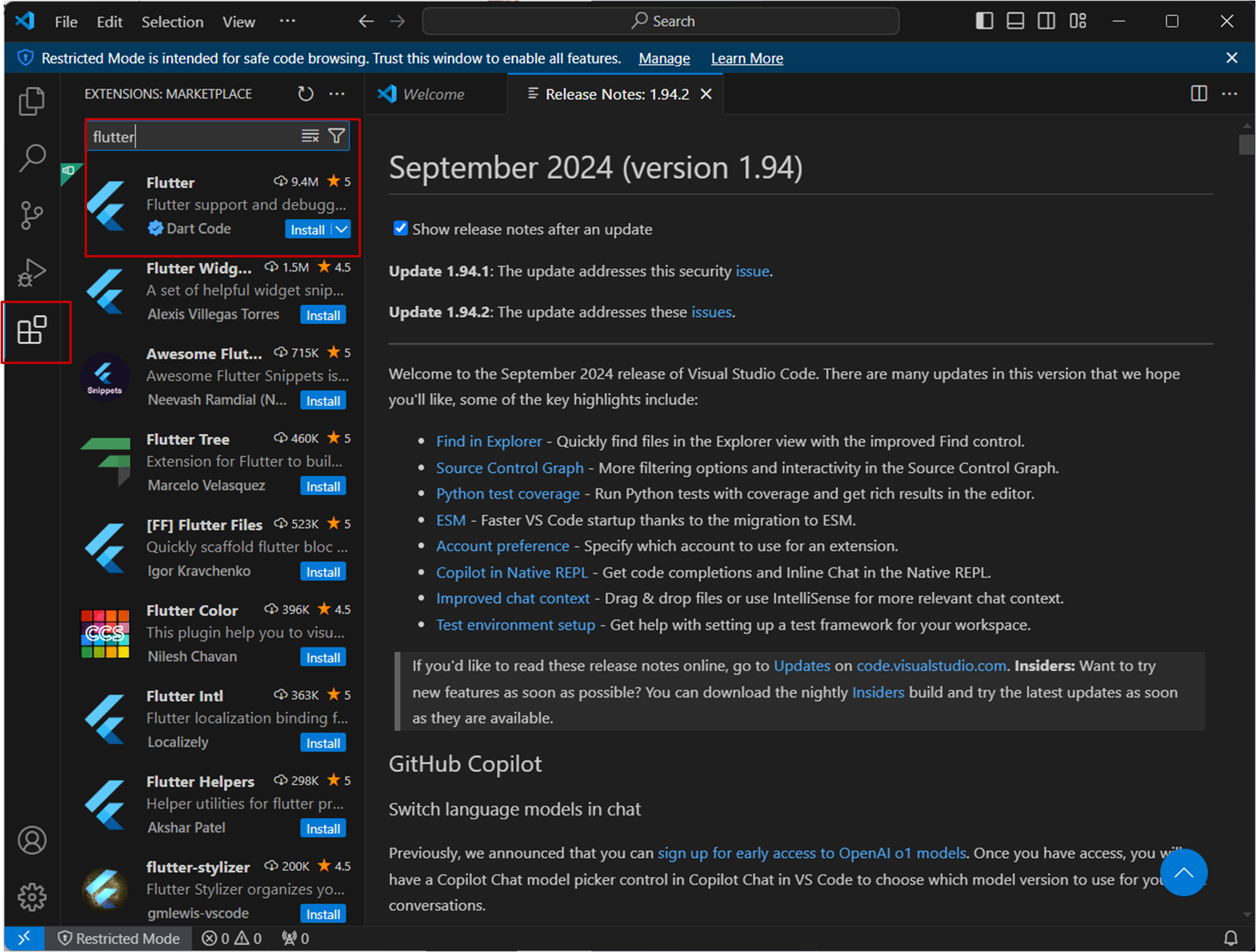 - VS Code Extensions 버튼 클릭 후 Flutter 검색