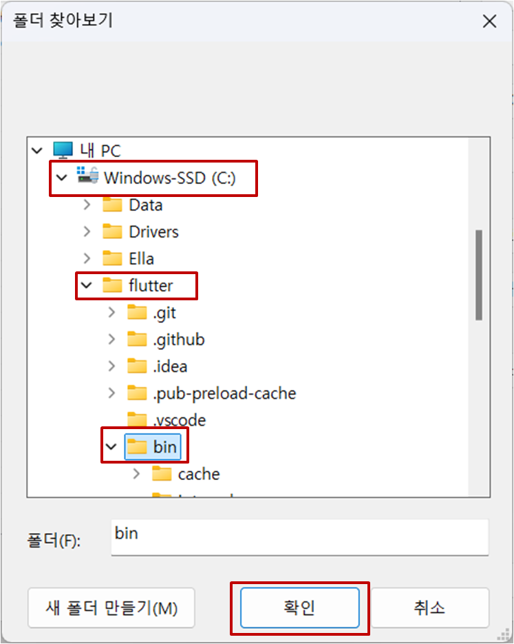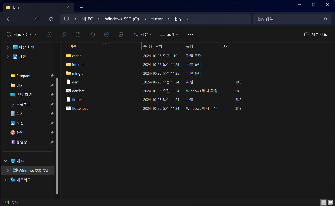- 압축 푼 폴더 경로를 찾아서 flutter 폴더 안의 bin 폴더 클릭 후 확인