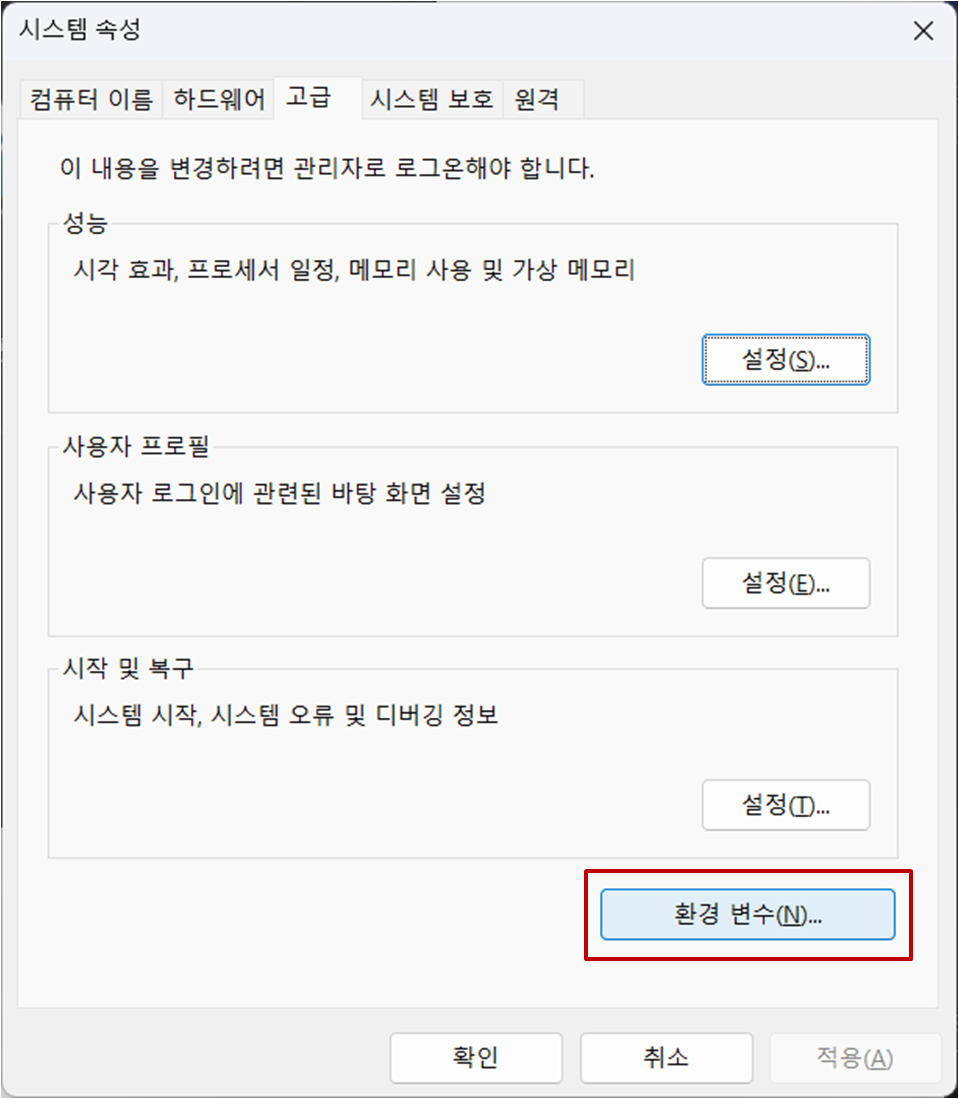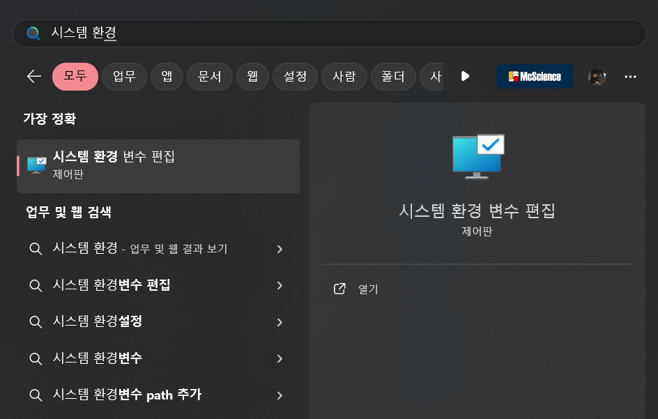- 윈도우 키 > '시스템 환경 변수 편집' 검색 후 클릭