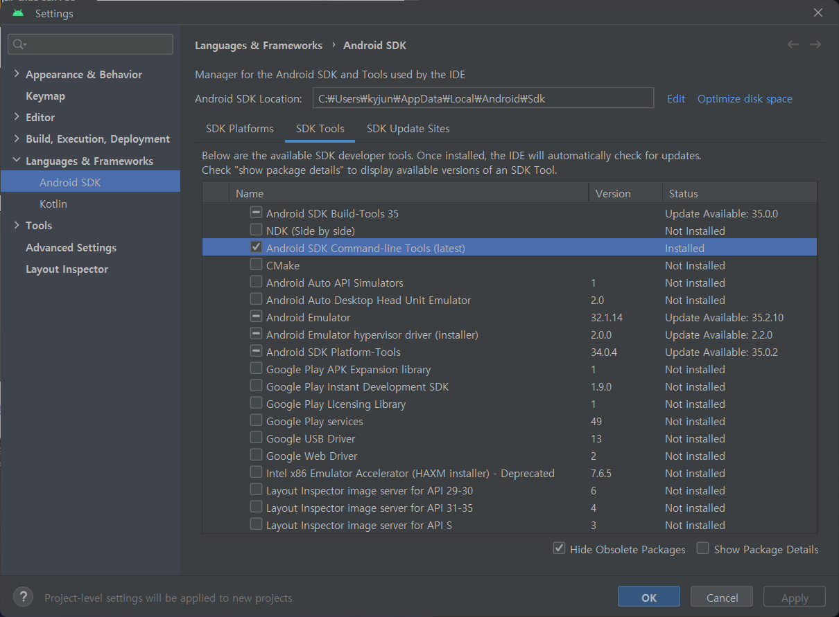 - SDK Tools에서 Android SDK Command-line Tools (latest) 클릭 후 Apply 적용