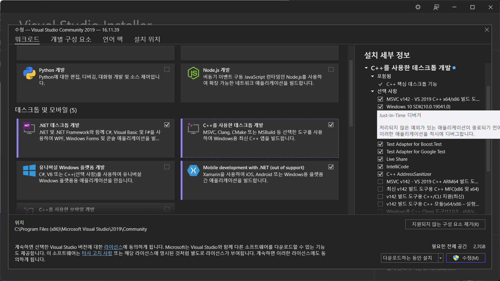 2. Visual Studio "Desktop development with C++" 설치 없음