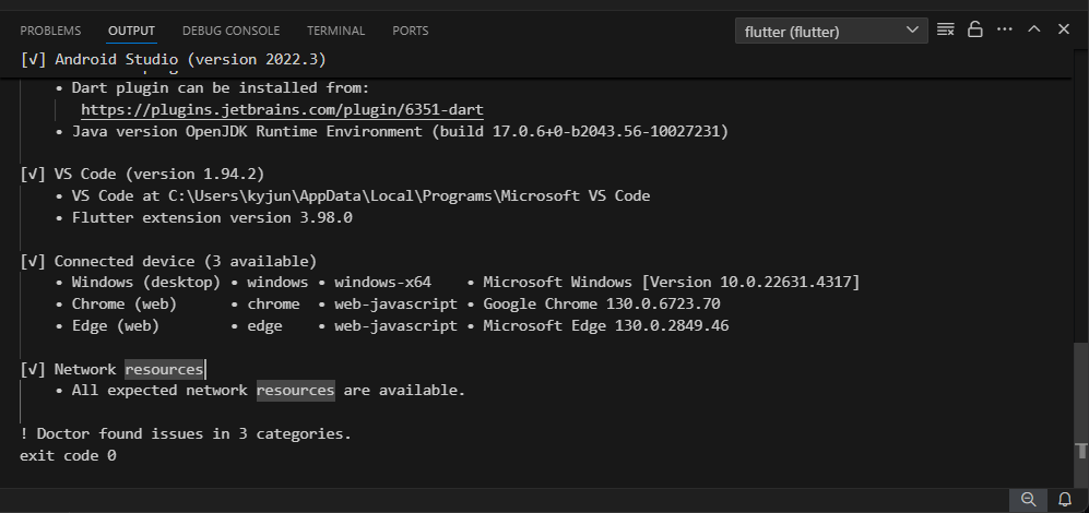 이렇게 OUTPUT 출력창에 Flutter Doctor가 검사한 내용을 알려줍니다.