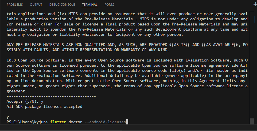 SDK 연결 후 다시 Flutter Doctor를 실행하면,