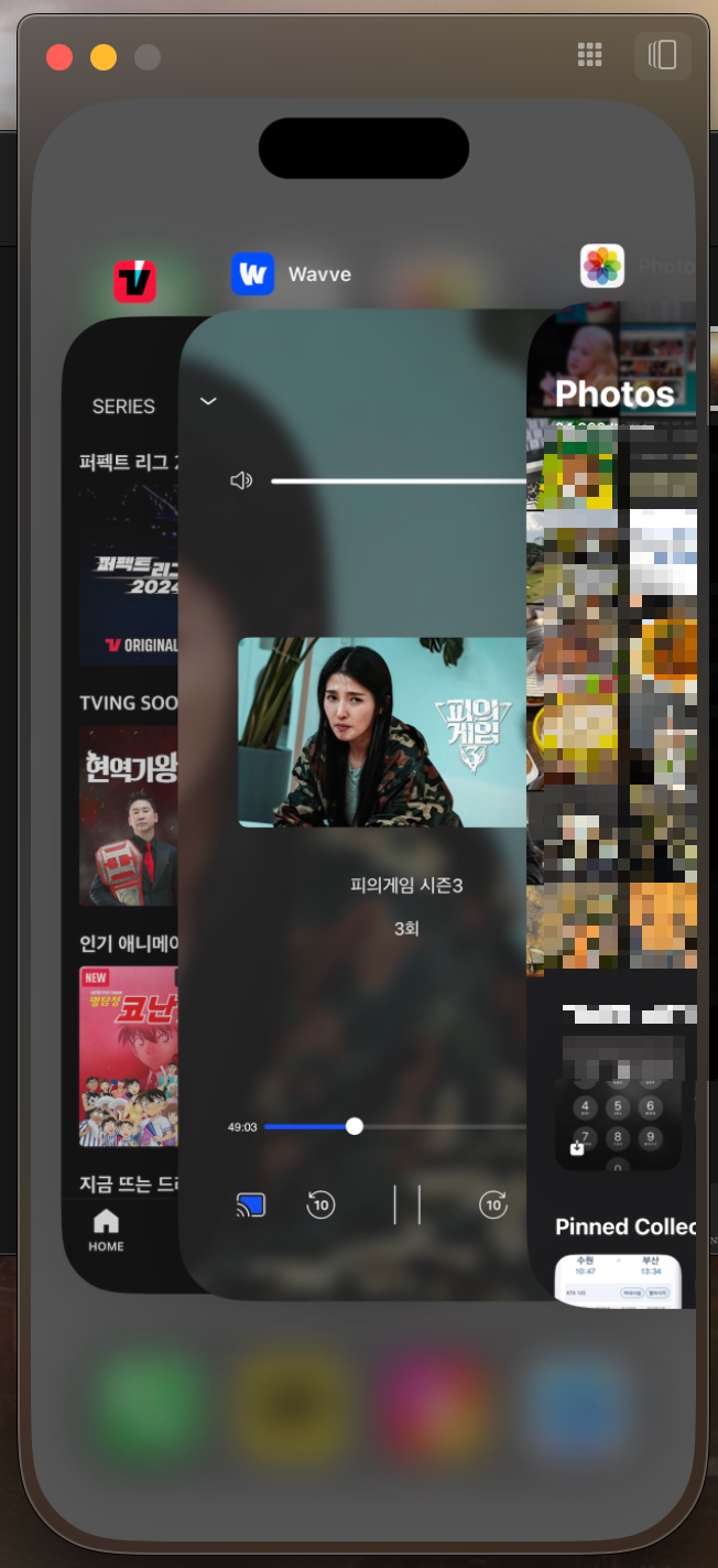 | 앱 전환기를 엽니다 | iPhone 미러링 창의 맨 위로 포인터를 이동한 다음, 오른쪽 상단 모서리에 있는 앱 전환기 버튼을 클릭하세요. 또는 키보드에서 Command-2를 누르세요. |