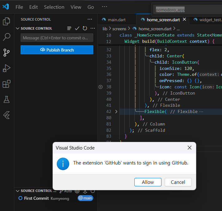 원격 저장소와 연결하기 위해 Publish Branch 버튼을 클릭하면,