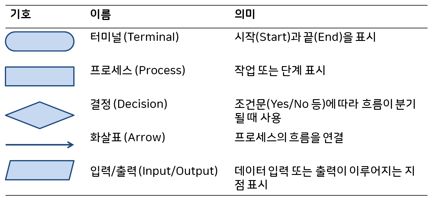 Flow Chart는 표준화된 기호를 사용하며, 주요 기호는 다음과 같다.