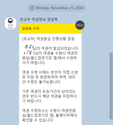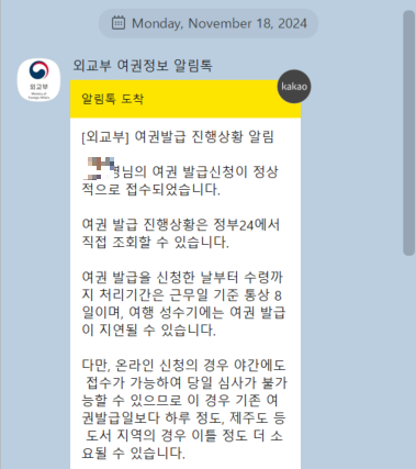 신청하고 나시면, 이렇게 외교부에서 알림톡이 옵니다.