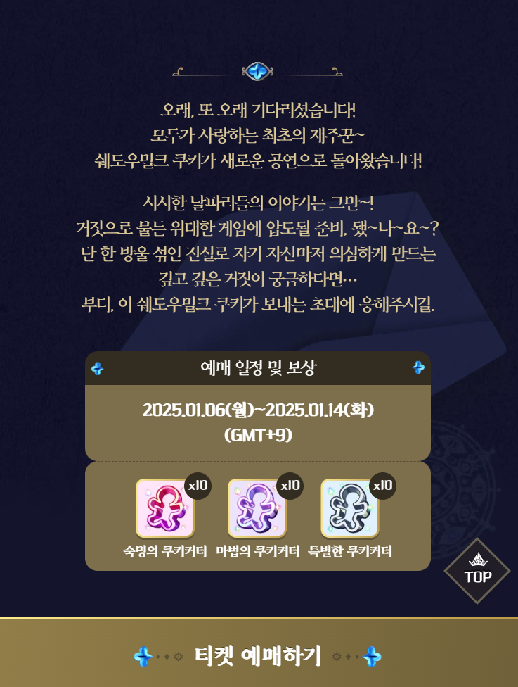 쿠키런: 킹덤 4주년을 기념해 쉐도우밀크 쿠키가 준비한 특별한 무대! 지금 티켓 사전 예약하고 다양한 이벤트에 참여해 풍성한 선물을 받아보세요!