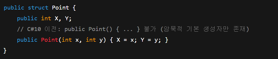 - C# 10부터는 struct에 명시적인 파라미터 없는 생성자를 선언할 수 있게 되었음 — 필요한 경우 문법/버전 확인.