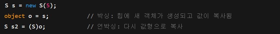 박싱은 힙 할당과 복사를 일으켜 성능에 영향이 있다(특히 빈번히 발생하면 문제).
