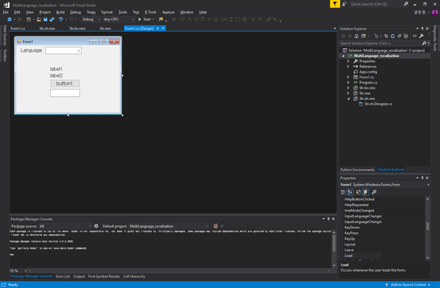 여기까지 한 후에 프로그램을 실행시키면 ComboBox 선택에 따라 label, button, textbox의 언어가 변경된다.