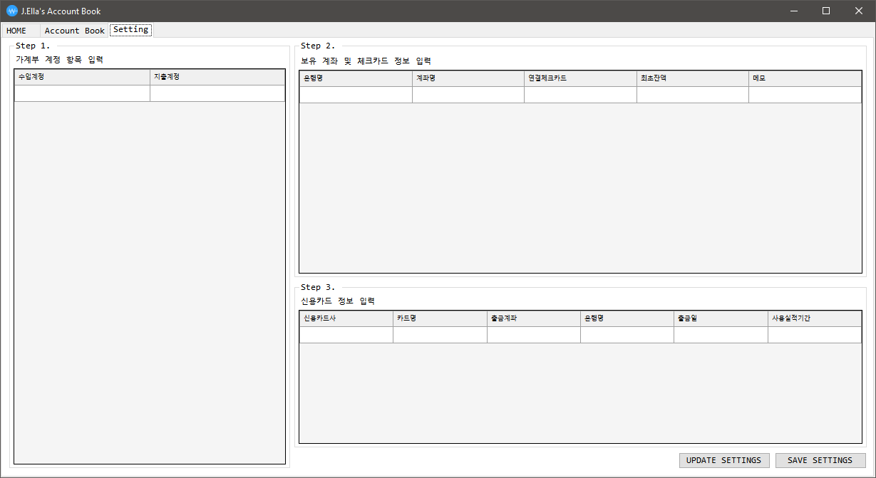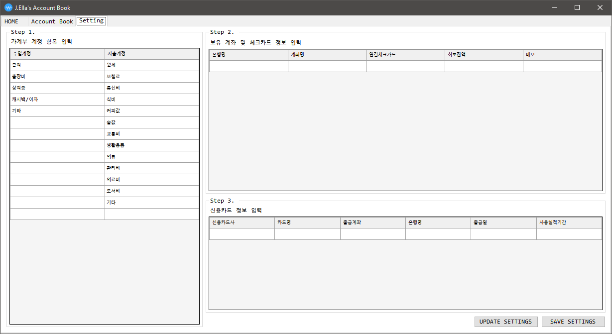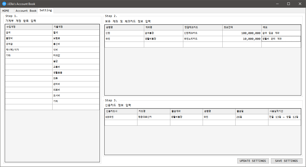 다음으로, Setting 버튼을 하나 만들어서 버튼 입력시에 계좌정보와 신용카드 정보를 입력하도록 했습니다.