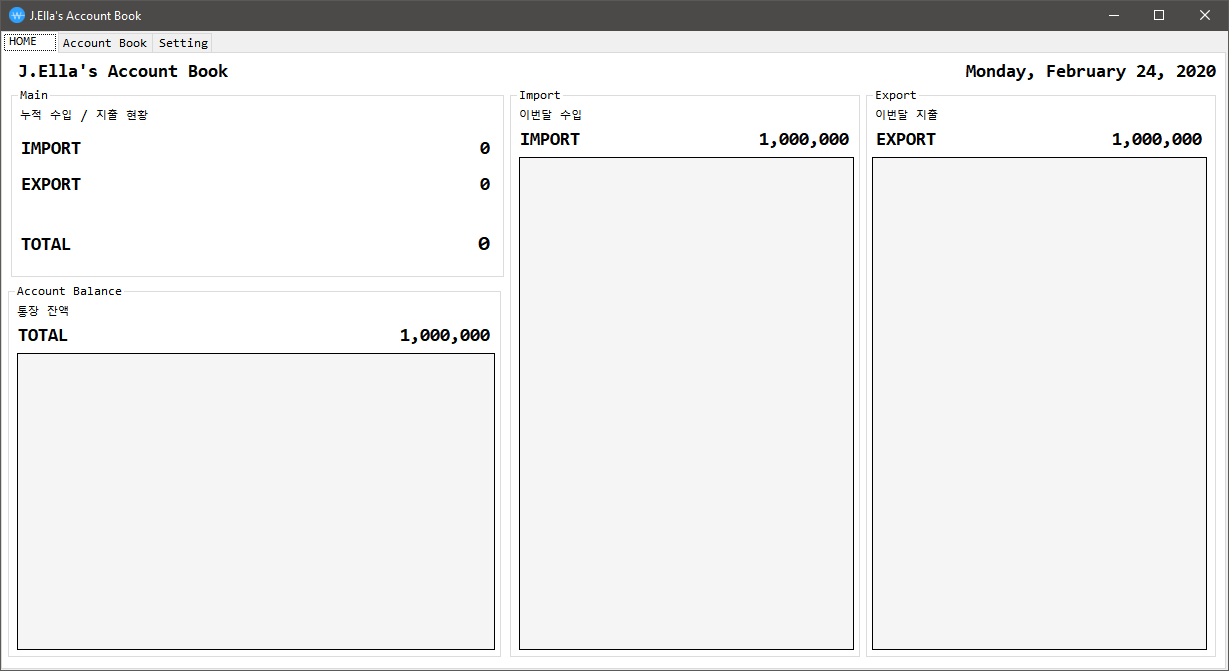 Home 탭에서는 누적 수입 / 지출 현황, 통장 잔액, 이번 달 수입 / 지출에 필요한 Label 6개와 DataGridView 3개입니다.