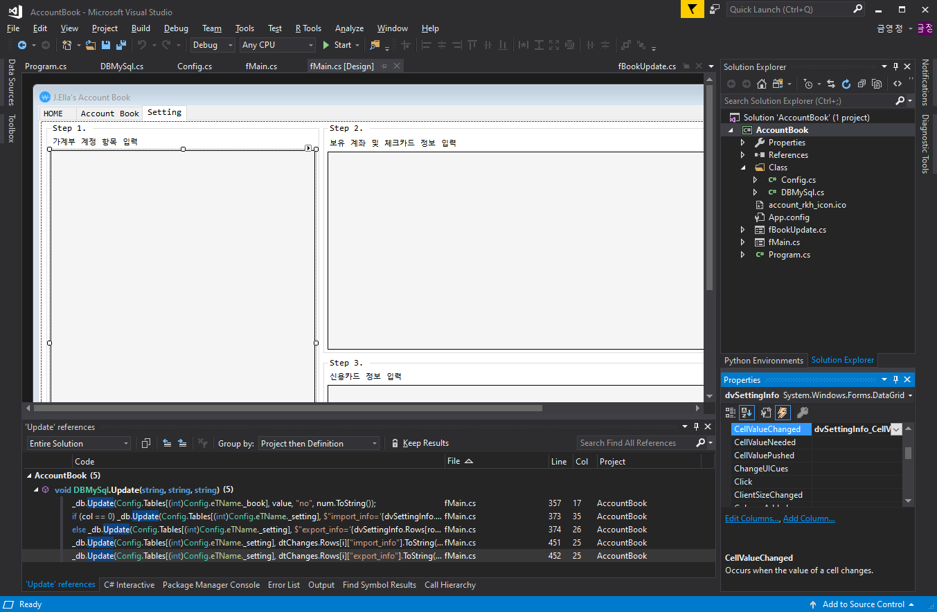 프로그램에서 가계부 계정을 입력하기 위해서 가계부 계정 항목의 DataGridView에 CellValueChanged 이벤트를 등록해 줍니다.