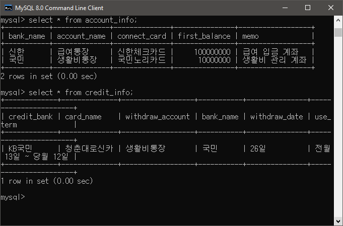 위는 입력화면 예시이며, 데이터베이스에 입력된 값은 다음과 같습니다.