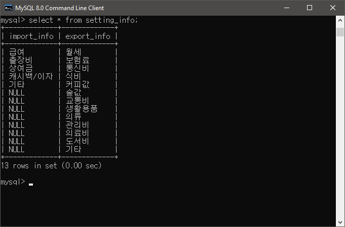 그리고 Column 값을 비교하여 import_info(수입계정)에 넣을지 export_info(지출계정)에 넣을지 판단합니다.