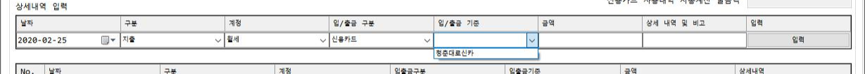 - 구분에서 지출을 선택한 경우는 계정 지출 계정(ExportInfo)에 등록한 값이 오고, 입/출금 구분에는 현금, 체크카드, 신용카드, 타인계좌이체의 Item 이 나오도록 했습니다.