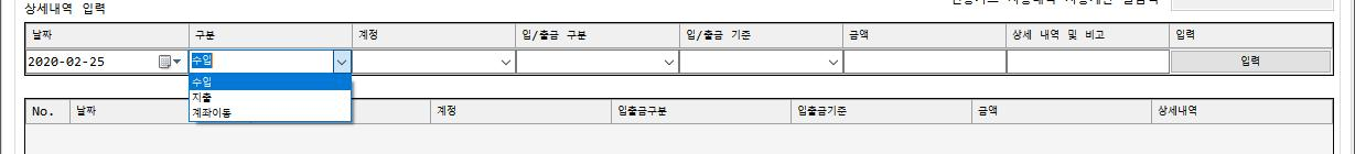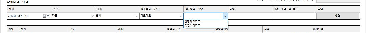 [3] 입/출금 구분(cbIEType)에서는 각각의 입출금유형에 따라 다음 입/출금 기준(cbIEStandard)의 comboBox 내용을 다르게 보이게 했습니다.