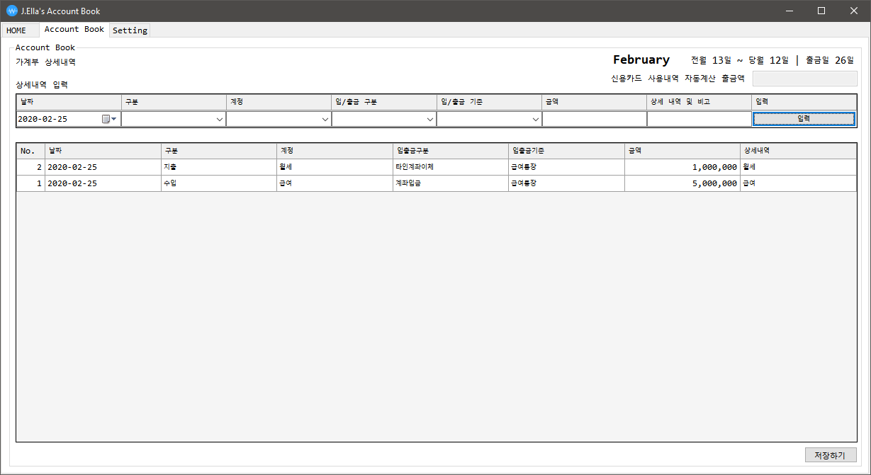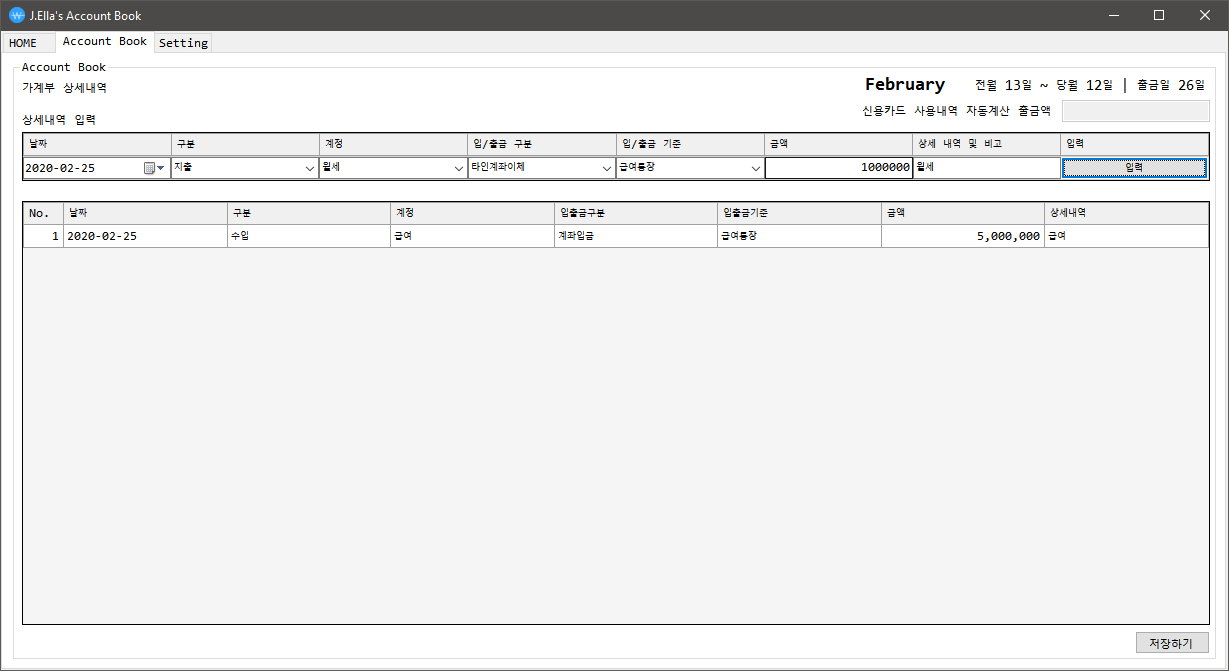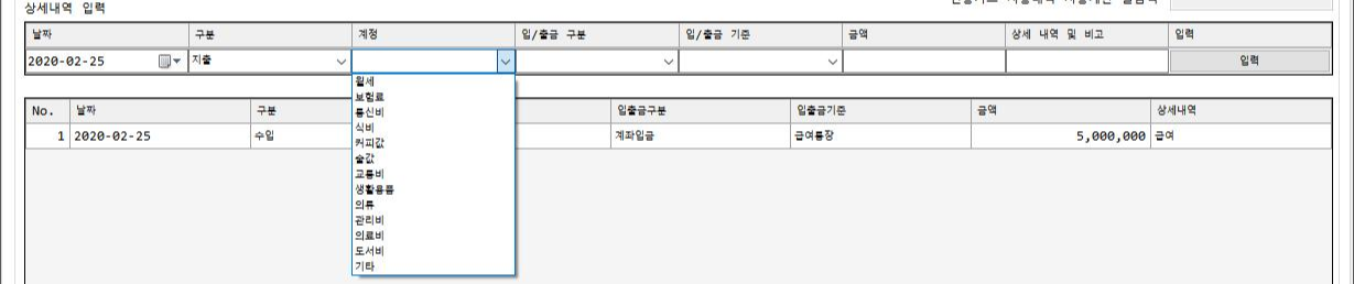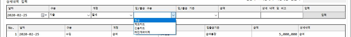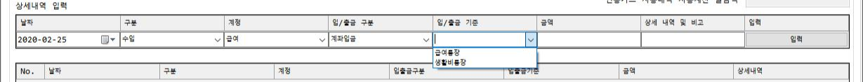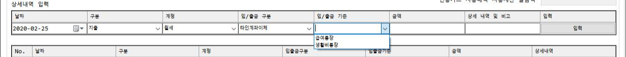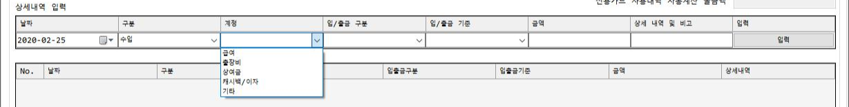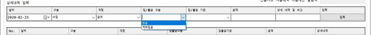 - 구분에서 수입을 선택한 경우는 계정에는 본인이 Setting에서 수입 계정(ImportInfo)에 등록한 값이 오고, 입/출금 구분에는 현금, 계좌입금이 나오게 됩니다.