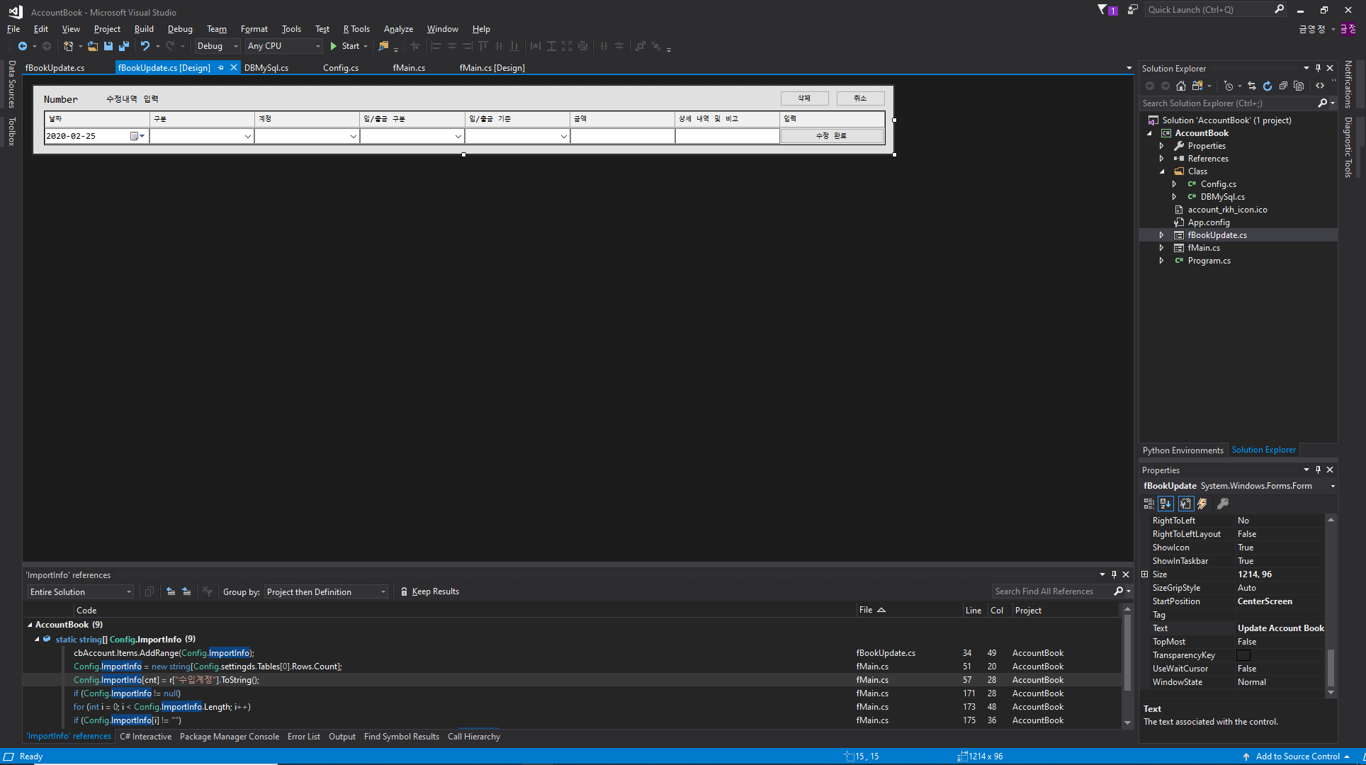 ++ 그리고 폼을 닫을 때 FormClosing 이벤트에서 fMain의 InitAccountBook() 함수를 재 호출해 줍니다.