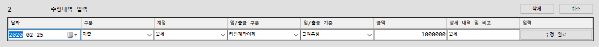 가계부 내역을 더블클릭했을때, 위와 같이 새 창이 뜨고 내역 수정을 할 수 있습니다.