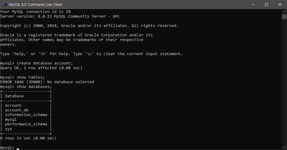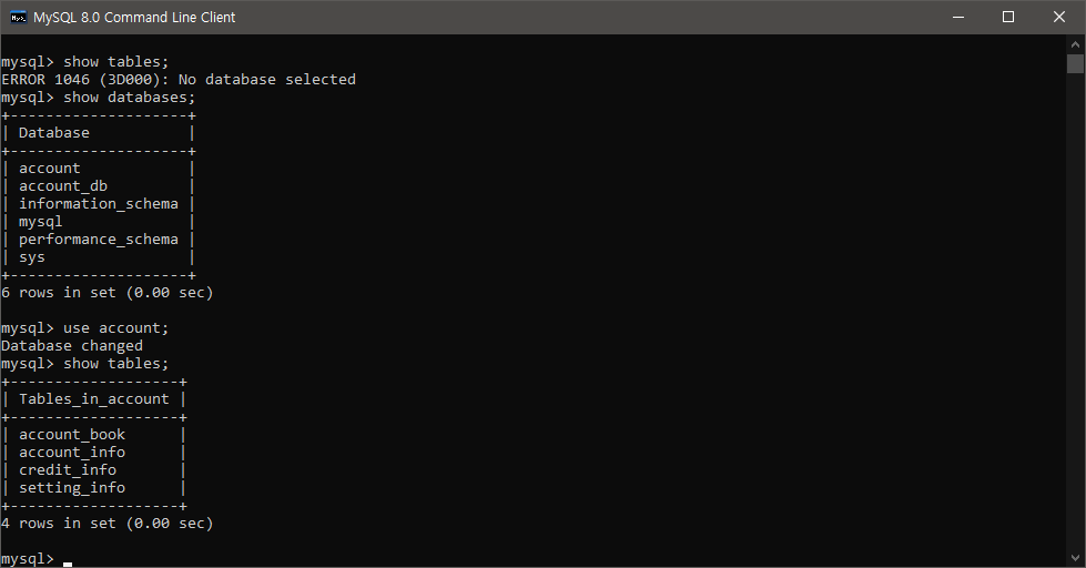 MySQL Command를 실행하면 Account 데이터베이스가 옮겨진것을 확인할 수 있다.