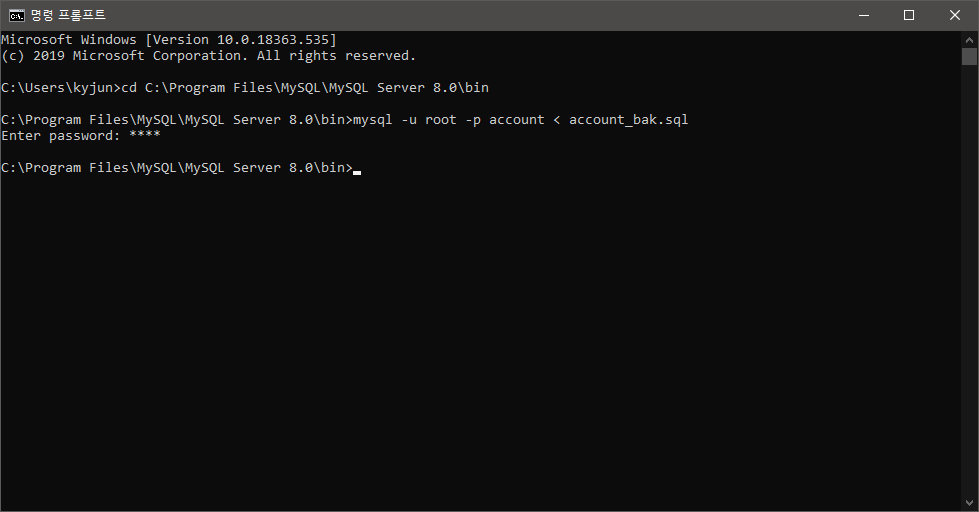 다시 Command로 돌아와서 백업 sql 파일을 데이터베이스에 넣어주면 완료.