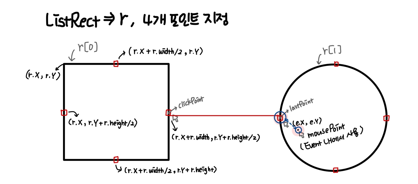마우스 위치를 확인해서 어떤 Rectangle 라인 위에 있는지 확인하고 listRect에서 몇 번째 도형인지 찾는다.