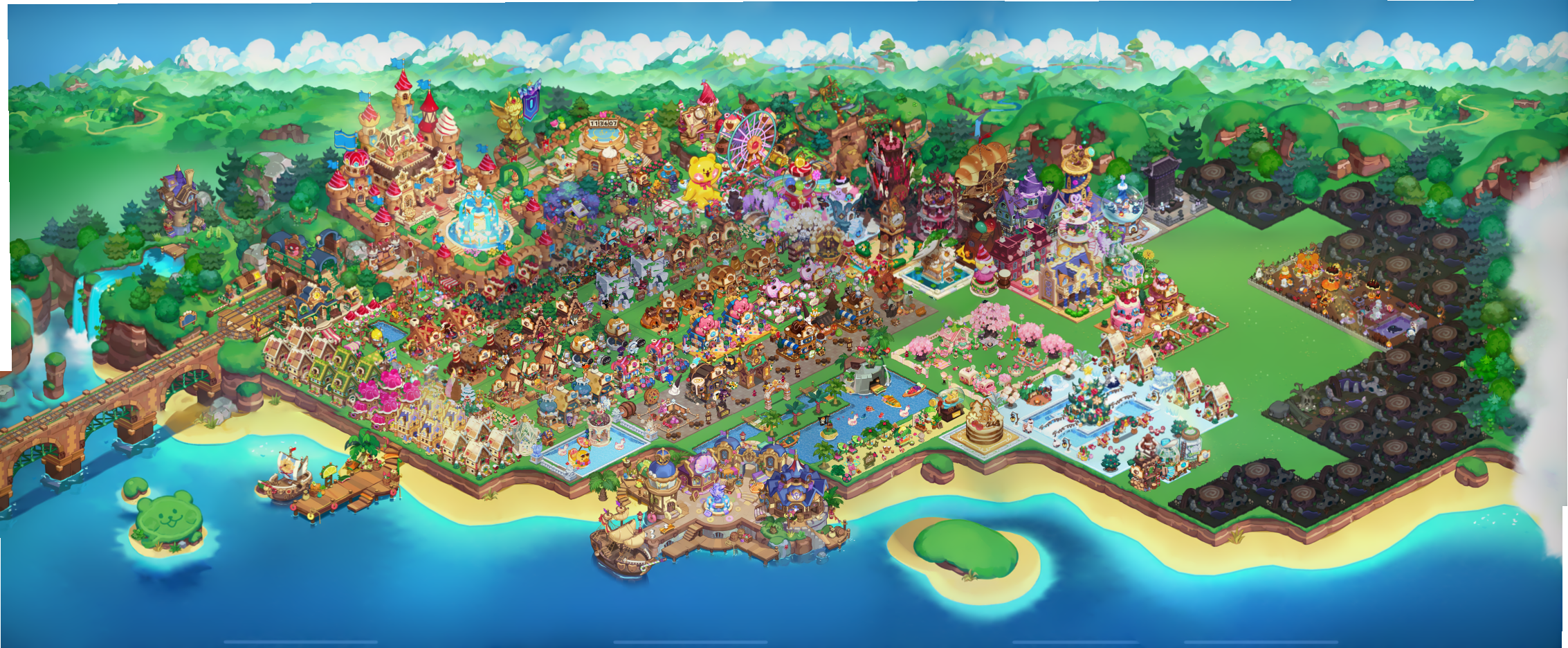 왼쪽엔 쿠키하우스, 중앙엔 생산 건물들을 몰아넣고, 오른쪽 위에는 랜드마크를 싹 몰아 넣고,