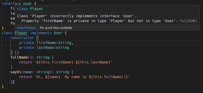 interface를 상속하는 것의 문제점 중 하나는 private property들을 사용하지 못함.