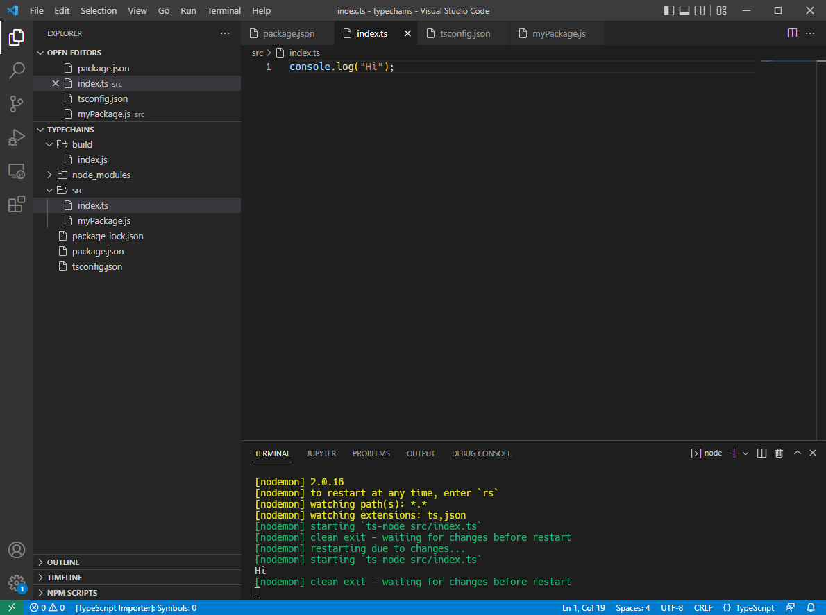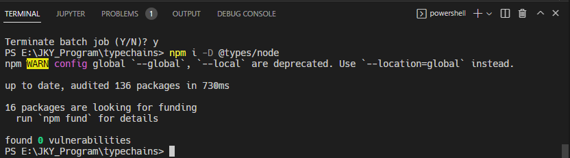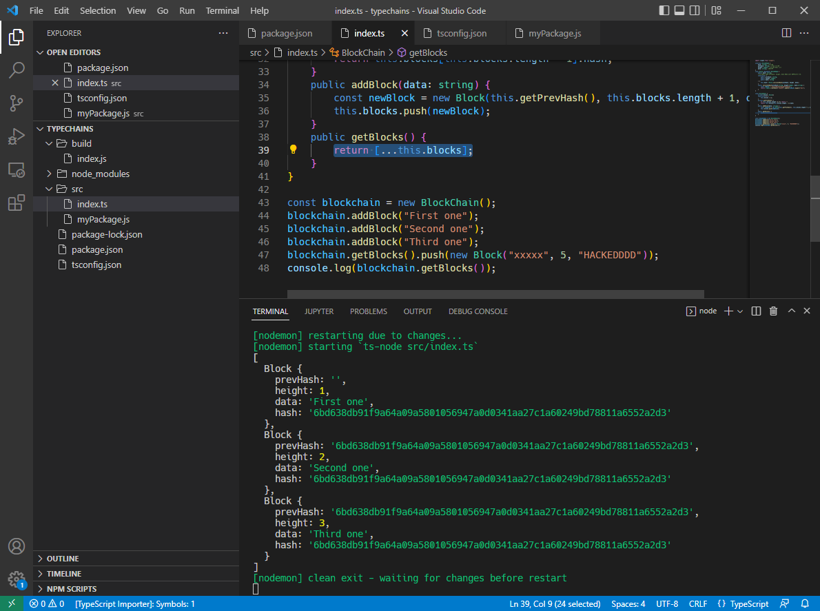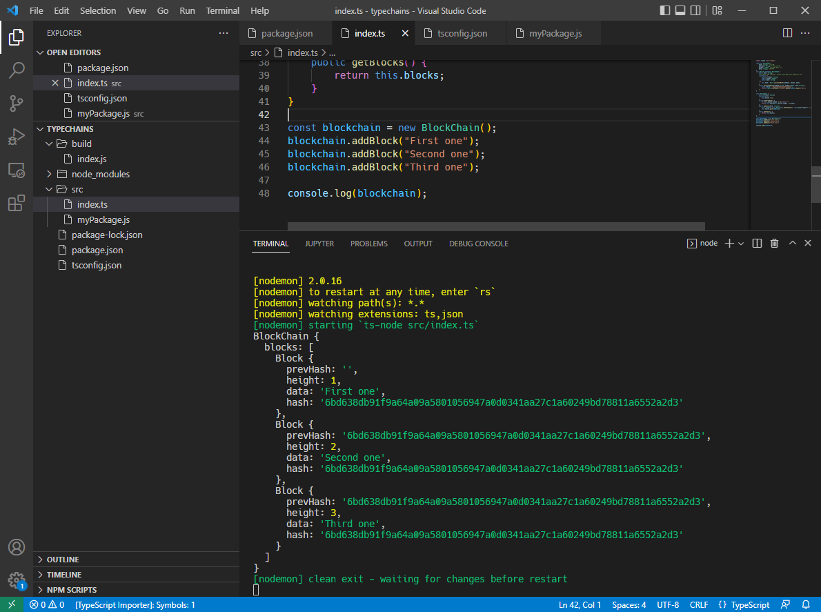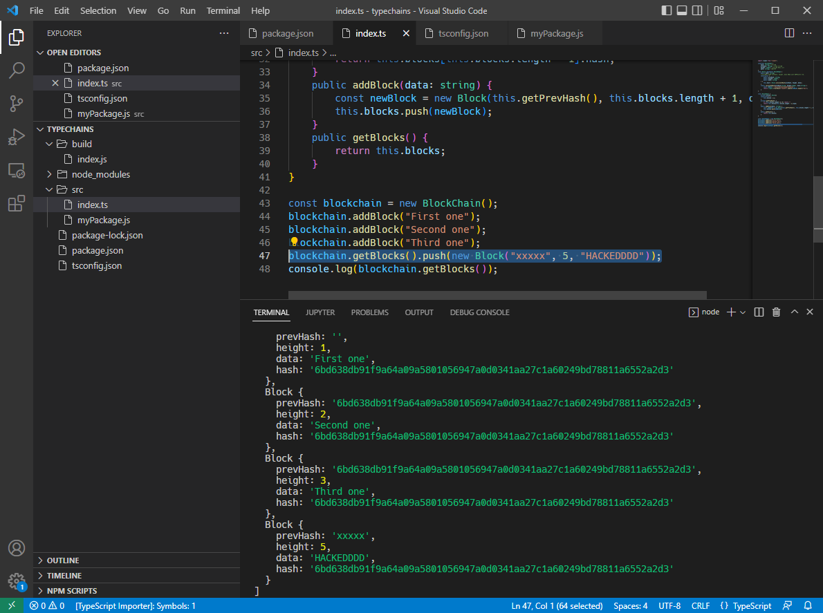 #5 TYPESCRIPT BLOCKCHAIN #5.0 Introduction #5.1 Targets #Create Typescript Project in VSCode 1. VS Code 에서 폴더를 연다. (folder name : typechains) 2. terminal을 열고 [>npm init -y] 를 입력한다...