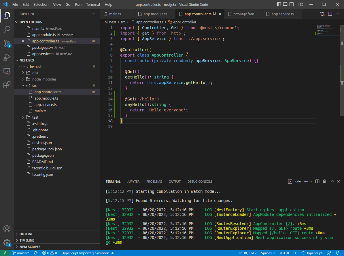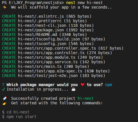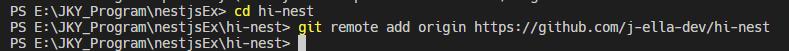 [>nest new "프로젝트이름"] "hi-nest" 라는 이름의 새 프로젝트를 생성함.