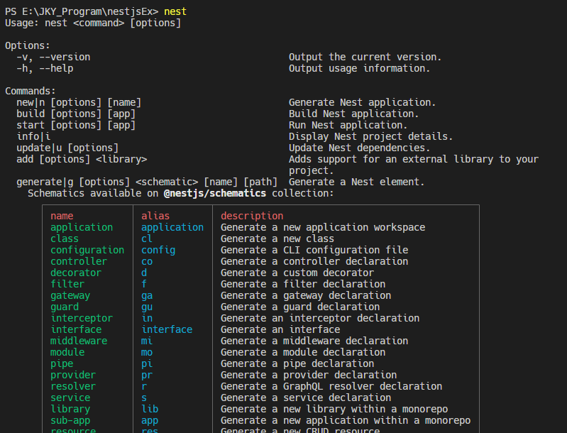 설치 후 [>nest] 입력하면 사용할 수 있는 명령어가 나옴.