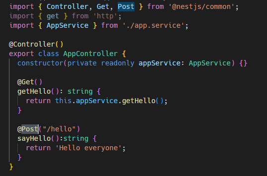 만약 이렇게 데코레이터를 @Post로 변경한다. 그러면, 자동으로 import에 Post가 등록이 됨.